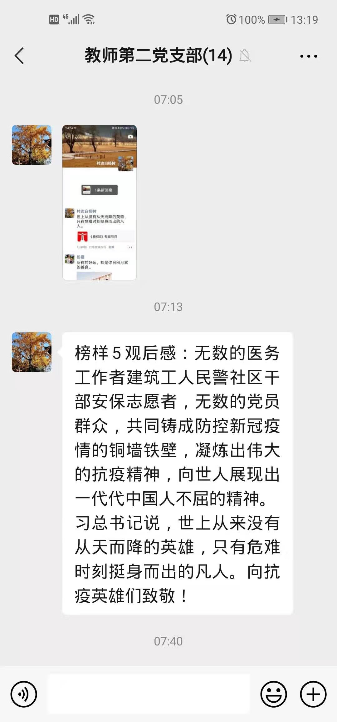 通过这次学习观看《榜样5》节目,党员教师纷纷表示,在庆祝建党100周年和开展党史学习教育之际,要深入学习投身疫情防控工作的共产党员的大无畏气概和伟大的抗疫精神,充分发挥党员干部模范带头作用,立足岗位做好本职工作,用忠诚担当诠释初心责任,切实担负起立德树人的光荣使命。