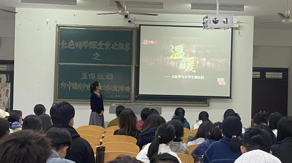 “红色研学课堂”以2021年12月由人民出版社出版发行的《习近平讲党史故事》为教材,主讲老师左海静结合庆祝中国共青团成立100周年重要历史节点,讲述了书中第一个故事:新民主主义时期“五四运动为中国共产党的成立做了准备”,从故事的原委、故事的延展和故事的启迪三个方面分享了五四运动的理论基础、历史人物和现实意义,阐述了以“爱国、进步、民主、科学”为主要内容的伟大五四精神及中国共产党产生的历史背景和条件,语言精炼,脉络清晰,情感真挚,使学生身临其境的感受到了革命先驱甘洒热血、救国救民的“初心和使命”,深刻理解了“知史爱党,知史爱国”的青年责任和担当。