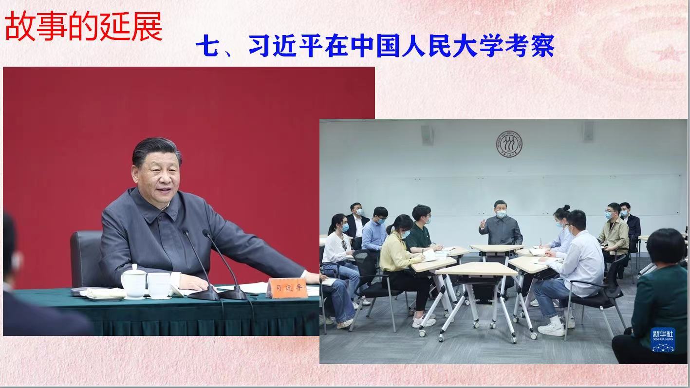 在课程研学中,同学们结合故事内容,通过“红色云展厅”的相关视频赏析、习近平考察中国人民大学时与大学生朋友们的温暖瞬间等,分享了五四精神的科学内涵对青年发展的启示、中国共产党人独特的价值追求的领悟、第二个百年奋斗历程中新青年新时代的使命与担当等体会和感想。