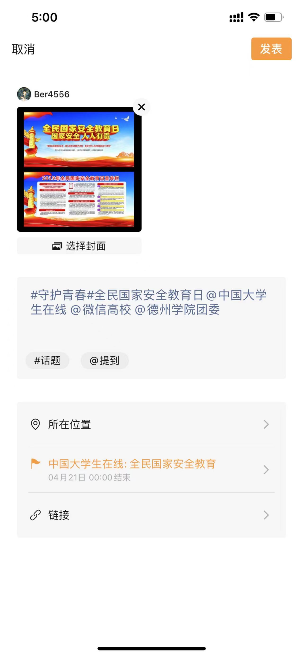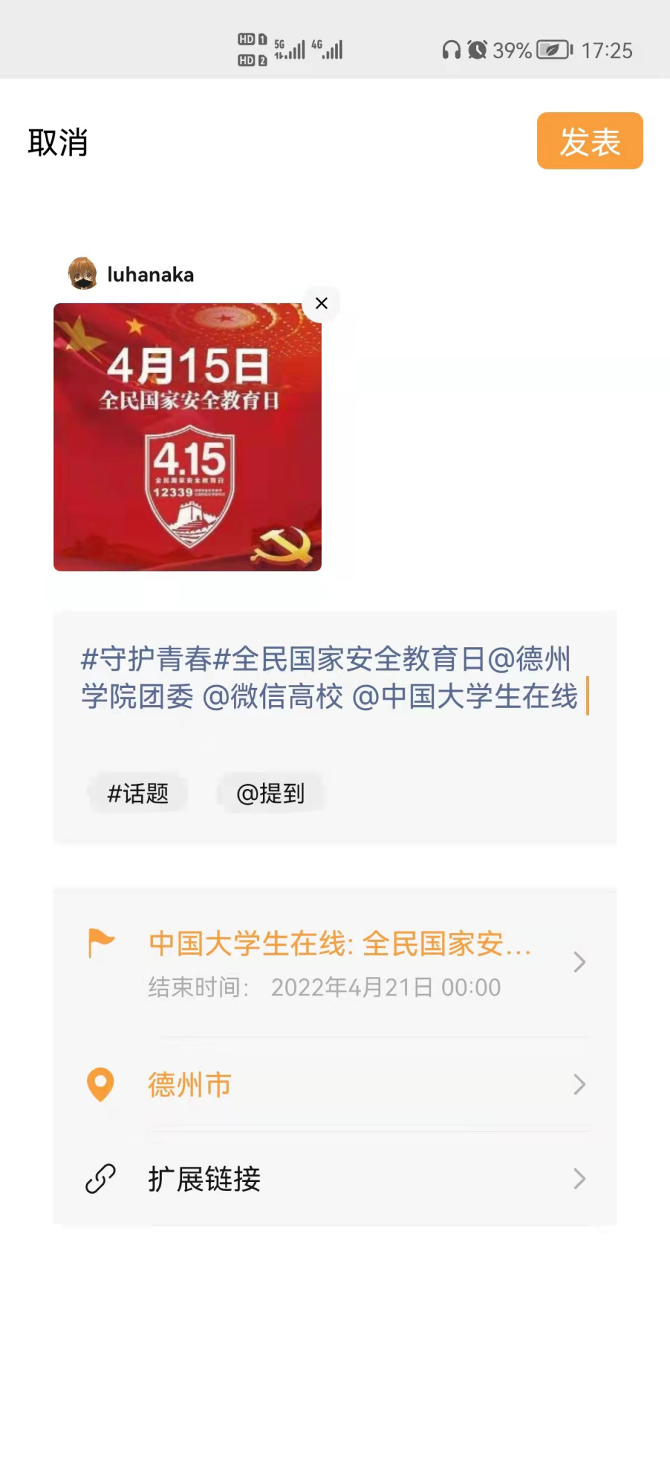 该活动由中国大学生在线、腾讯发起“守护青春、感悟新时代国家安全成就”全民国家安全教育日线上视频号话题,学生们通过关注微信视频号“@中国大学生在线”后进入首页“全民国家安全教育”活动专题,添加话题#守护青春 #全民国家安全教育日,并@中国大学生在线 @微信高校 @beat365在线体育官网登录入口官方账号后发布原创主题短视频,参与话题接力。
