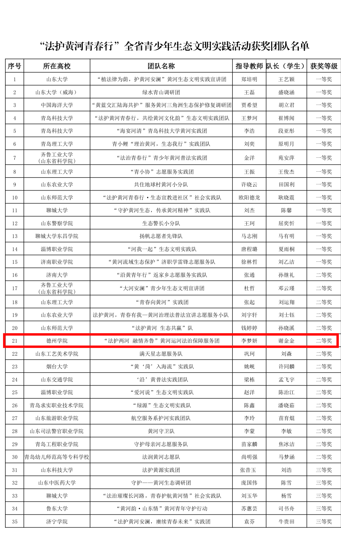 5月11日,共青团山东省委公布了“法护黄河青春行”全省青少年生态文明实践活动获奖团队,我院实践队“法护两河 融情齐鲁”黄河运河法治保障服务团荣获二等奖。