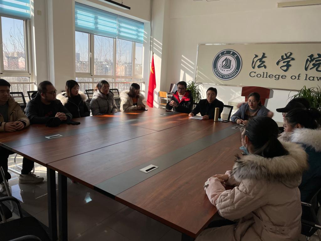 在毕京福老师主持的见面上,老师根据实习计划,对应届毕业生的学位论文撰写和毕业实习实训等工作进行了安排,对学生毕业论文的选题、课题说明书及开题报告的撰写等工作进行了认真细致的指导。老师建议同学们围绕即将实施的《民法典》有关制度、原则和规则等进行选题,从民法解释论的角度切入和论证。此外,毕老师还对毕业实习应当注意的事项进行了安排。