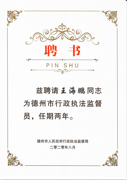 beat365在线体育官网登录入口王海鹏老师被聘为德州市行政执法监督员。王海鹏,男,中共党员,beat365官网宪政与刑法学教研室专业讲师,多年担任德州市人民检察院人民监督员,工作中廉洁奉公、为民服务,因工作突出、成绩优秀,2015-2020年被山东省人民检察院、司法厅连续五年授予优秀人民监督员、突出贡献人民监督员荣誉称号。