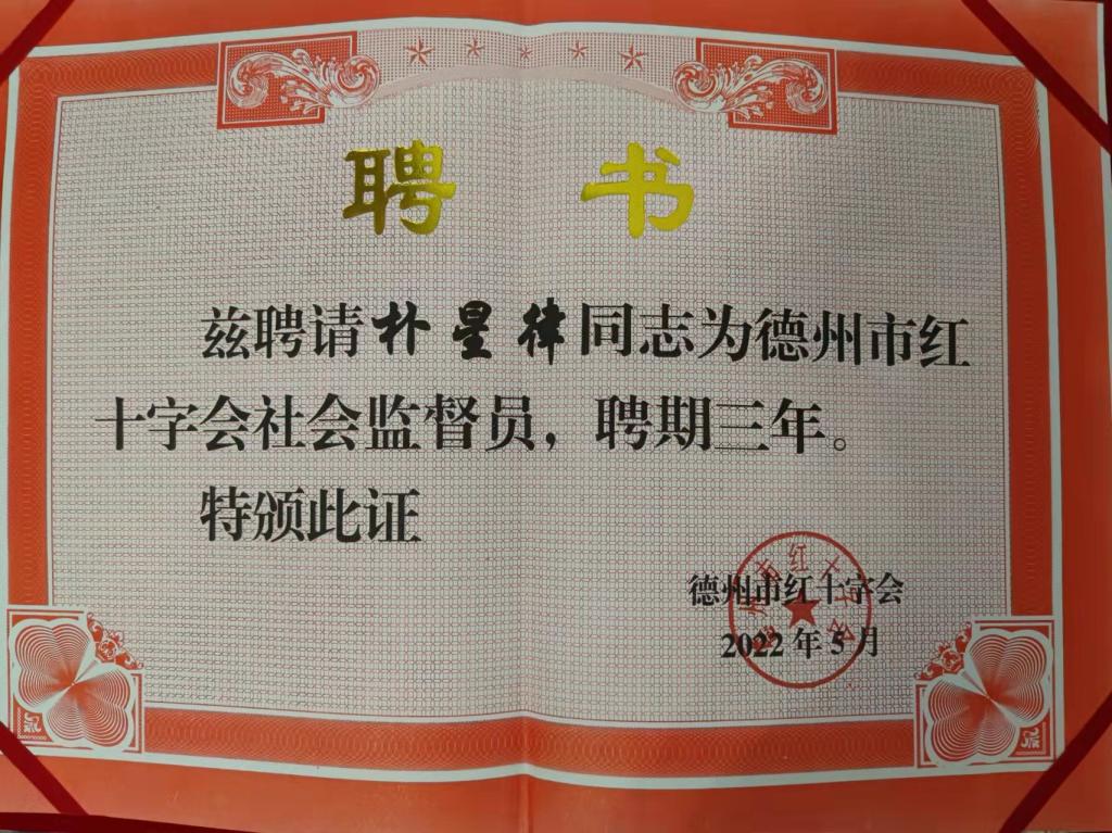 2022年5月12日,beat365在线体育官网登录入口朴星律博士受聘为首批德州市红十字会社会监督员。在德州市红十字会社会监督员聘任仪式暨社会监督工作座谈会议上,朴星律博士围绕我市红十字宣传工作提出了意见建议。今后,朴星律博士将积极发挥好社会监督员的作用,为促进全市红十字事业高质量发展做出贡献。