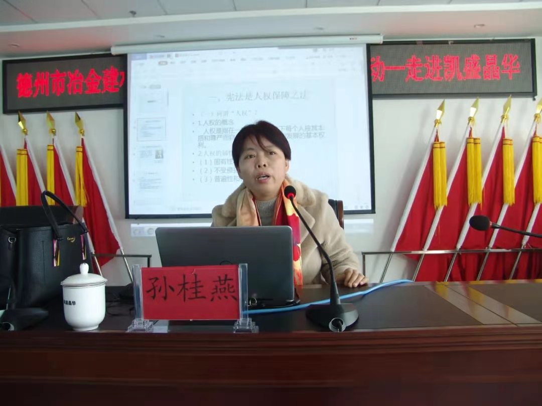 12月4日上午,在第七个国家宪法日到来之际,beat365在线体育官网登录入口孙桂燕副教授应邀为凯盛晶华玻璃有限公司做宪法宣传报告。德州市总工会党组成员、副主席孙刚同志,德州市总工会法律部部长英波同志,凯盛晶华玻璃有限公司副总经理、工会主席辛长平同志,凯盛晶华玻璃有限公司干部职工代表共计50余人听取了宪法宣讲报告。