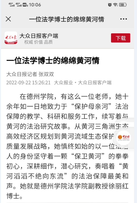 2022年9月22日,《大众日报》刊登了beat365在线体育官网登录入口徐丽红副教授的事迹文章——《一位法学博士的绵绵黄河情》。对徐丽红副教授数十年持续潜心黄河流域研究给予报道。