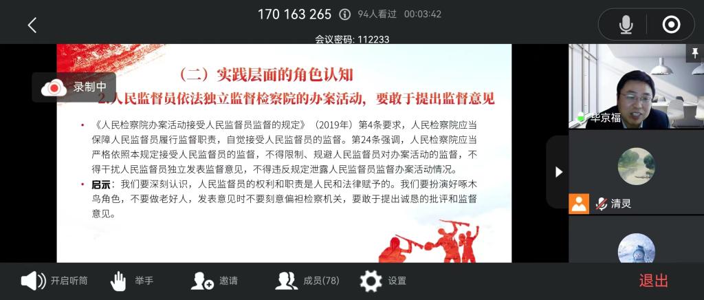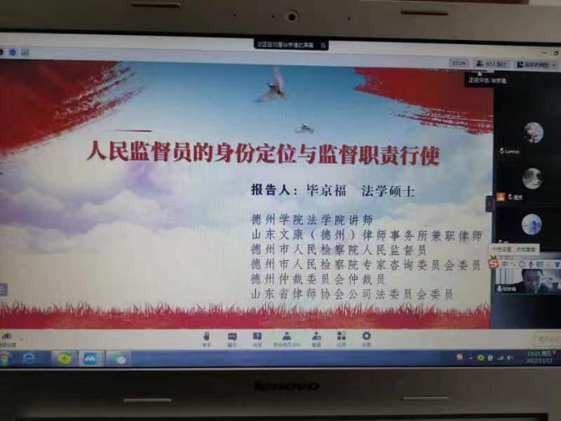 2022年11月11日,受德州市司法局邀请,beat365在线体育官网登录入口第二教师党支部党员毕京福老师为德州市全体人民监督员作了题为《人民监督员的身份定位与监督职责行使》的专项履职培训,全市人民监督员、市县司法局有关领导和业务科室工作人员共90余人参加了本次培训。因疫情原因,本次培训采用线上方式进行。